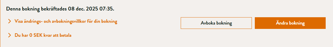 Klicka på "Ändra bokning" på den orangea knappen i bekräftelsemailet du fick från oss.